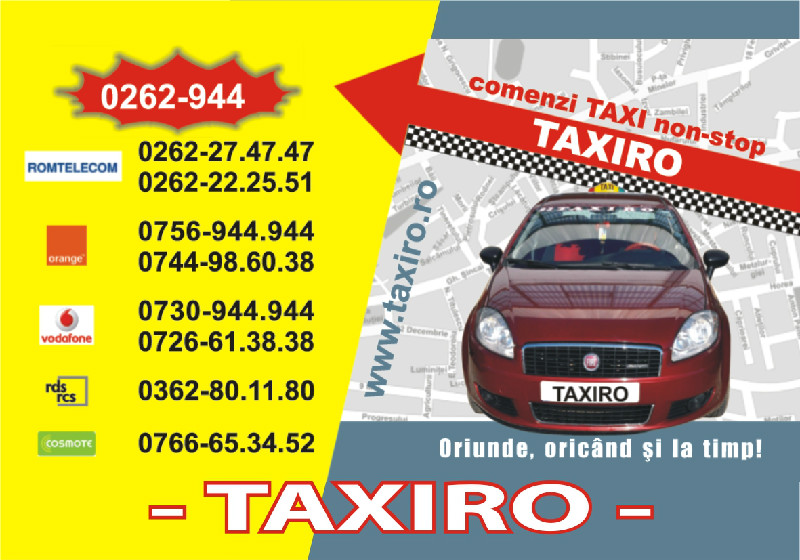 Societatea TAXIRO - o firma cu experienta de peste 12 ani in domeniul transportului de persoane in regim de taxi, cu un parc auto de peste 120 masini permanent intretinut si reinoit, TAXIRO TAXI furnizand servicii profesioniste, garantand in orice moment siguranta, confort si rapiditate pana la destinatie. Societatea TAXIRO TAXI - pentru a asigura calitatea serviciilor oferite pune la dispozitia clientilor un dispecerat modern deservit de operatoare autorizate care va ofera un sprijin de neinlocuit in timp real precum si o comunicare de calitate cu clientul, o echipa de soferi profesionisti si manierati care va stau la dispozitie non stop 24 din 24 ore. Compania noastra ofera transport taxi pe baza de contract pentru persoane fizice si juridice, livrari pe baza de comisioane, precum si transport pe plan local in regim de taxi pentru persoane care se afla in vizita pe teritoriul judetului.